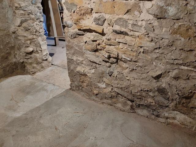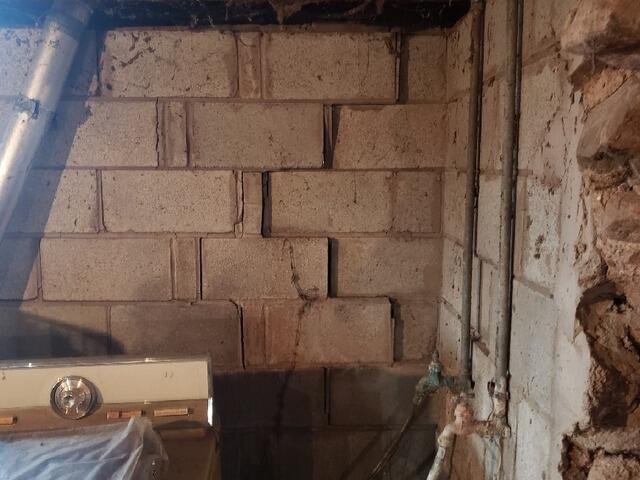 An old farmhouse in Winneconne showed classic signs of structural stress: a block/stone basement wall with stair-step and horizontal cracking, slight inward bowing, bouncy first-floor rooms, and makeshift wood posts with stacked shims under the main beam.