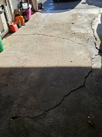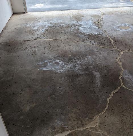 A homeowner in Winneconne had a settled garage floor slab. The concrete dropped near the overhead door, leaving a lip at the threshold, widening cracks, and gaps along control joints that let water and road salt seep beneath the slab.
