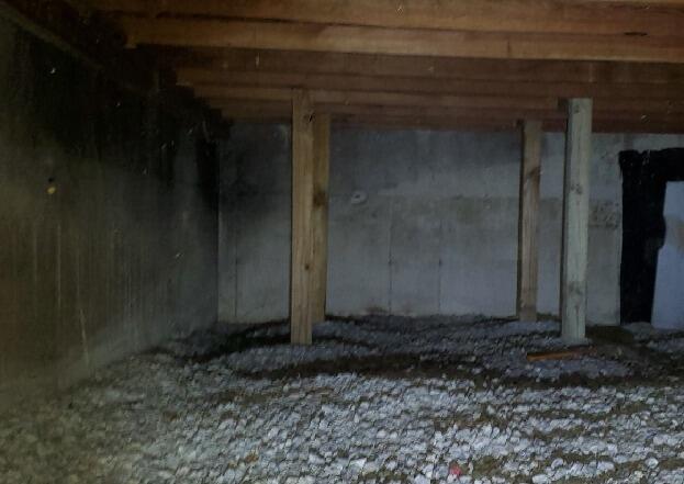 A homeowner in Winneconne had a damp, musty crawl space with signs of wall movement: hairline/stair-step cracks and slight inward lean on a perimeter wall. Exposed soil drove humidity and odors into the living space, and the floors above felt cold—especially near the entry.