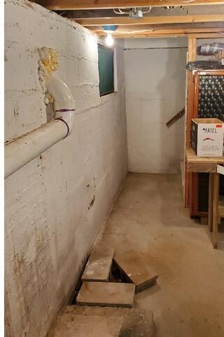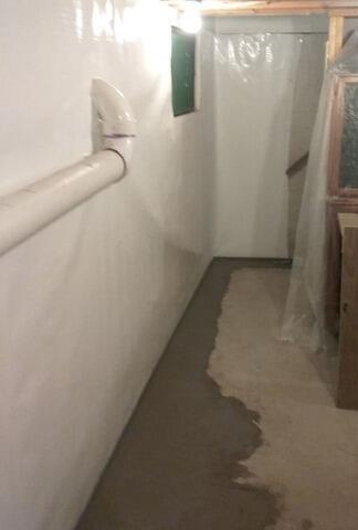 The basement in this Pembine, WI home showed ongoing signs of water intrusion along the perimeter walls, including damp block surfaces and moisture staining at the wall-to-floor joint. During heavy rain and seasonal snowmelt, groundwater would seep into the basement, creating wet basement repair concerns and contributing to musty basement odor solution issues common in northern Wisconsin homes. The homeowner was searching for basement waterproofing near me and needed a permanent basement waterproofing contractor solution rather than temporary patch repairs.