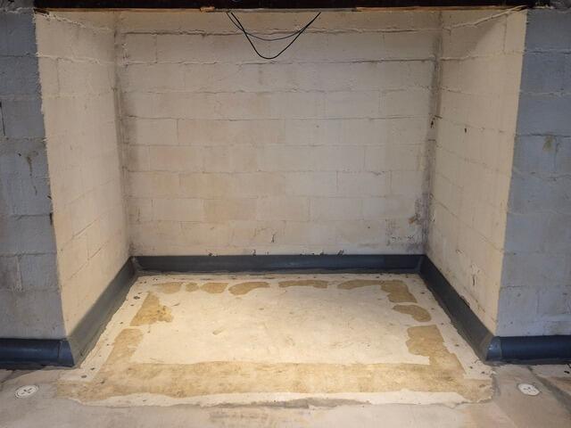 Sure-Dry installed the DryTrak® Baseboard Drain System along the inside perimeter of the basement. This low-profile drainage channel was securely sealed to the floor surface to collect water seeping through the cove joint and direct it efficiently into a new SuperSump® system. The SuperSump then discharges the collected water safely away from the foundation, ensuring dependable protection during wet weather.