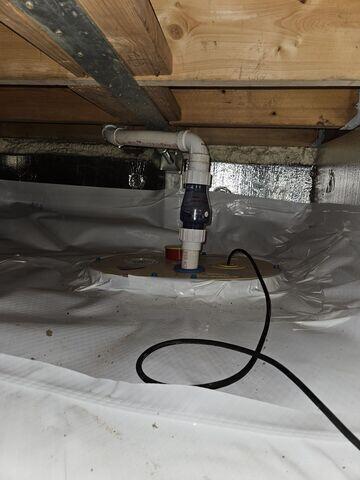 To accomplish this, we completely covered the crawlspace in CleanSpace, which is a waterproof liner that keeps all water out. That way, no belongings in the crawlspace will be affected by the water and the floor and floor joists above won't begin to rot and mold.