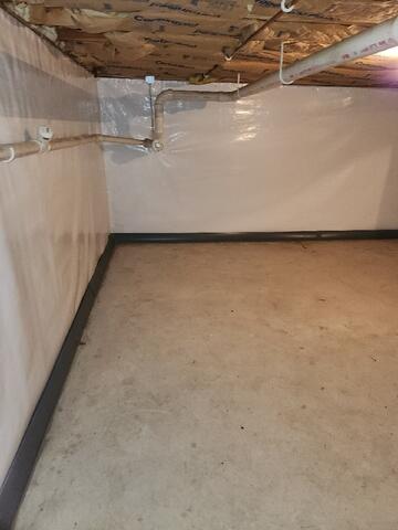 After an inspection, our System Design Specialist identified moisture intrusion, poor insulation at the rim joist, and the need for better water control. To address these issues, our team installed a combination of RimTight, CleanSpace, and DryTrak systems. The rim joist was sealed with RimTight spray foam to reduce air leakage and help limit condensation. CleanSpace encapsulation was then installed to seal the crawl space floor and walls, blocking ground moisture and helping prevent mold growth. To manage water along the perimeter, the DryTrak baseboard drainage system was added, directing water into the existing sump pump system for proper removal.