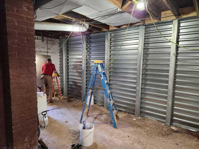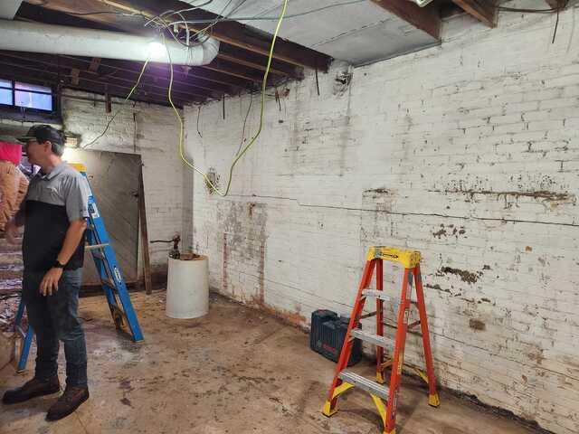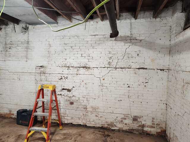During inspection, we documented substantial lateral deflection across the basement’s original stone and block walls, along with mortar deterioration consistent with long-term hydrostatic pressure. Preserving the historic exterior ruled out any large-scale excavation, so we recommended the EverBrace™ system to provide full interior stabilization while maintaining the building’s original façade.