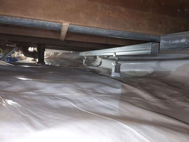 The Sure-Dry installation team installed CleanSpace® Wall Vapor Barrier to encapsulate the crawl space and prevent ground moisture intrusion, then placed SmartJack® support posts to lift and stabilize the floor framing above. This integrated crawl space repair solution created a clean, controlled environment while restoring proper structural support and long-term reliability for the home.
