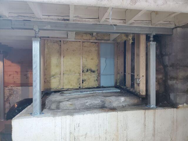 Karen had a wall running through the middle of her basement. Over time it has settled causing the floor above to slope. Sure-Dry installed the SmartJack Crawl Space Support System to stabilize the foundation beams and floor joists. It's the ideal solution to lift the floors above toward their original elevation and reduce floor "bounce" caused by weakened floor joists or excessive spans.