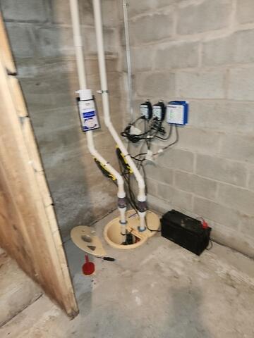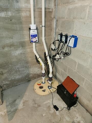 To restore these homeowners' piece of mind, Sure-Dry Basement Systems installed their TripleSafe™ Sump Pump System. The ripleSafe™ Sump Pump System provides three levels of protection for your basement and your peace of mind. For normal functioning, the TripleSafe™ has a powerful, cast-iron Zoeller® ⅓ horsepower sump pump set at the lowest level. For heavy volumes of water or in case of primary pump failure, a second, more powerful Zoeller® ½ hp pump set a bit higher in the liner will take over. In case of a power outage, our UltraSump® battery backup sump pump, set at the highest level, will pump 11,500 gallons or more on a fully charged battery!