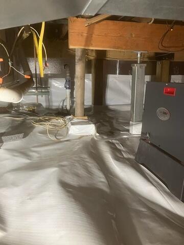 The Sure-Dry installation team expertly lined the entire crawl space floor and walls with the CleanSpace system, a durable 20-mil vapor barrier that prevents moisture, odors, and pests from entering the space. To complete the system, they applied Rim Tight closed-cell spray foam insulation to the rim joists, eliminating air leaks and improving energy efficiency throughout the home. Together, these upgrades transformed the crawl space from a damp, uncomfortable area into a clean, conditioned, and well-sealed space that protects the home’s structure and improves comfort year-round.