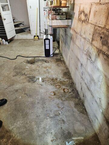 During the inspection, the System Design Specialist identified active seepage at the footing and documented moisture spreading across several areas of the basement floor. The existing sump pump was undersized and unable to keep up with increased groundwater pressure during snowmelt and storms. To resolve the issue, the specialist recommended installing a WaterGuard® interior drainage system tied into an upgraded SuperSump®.
