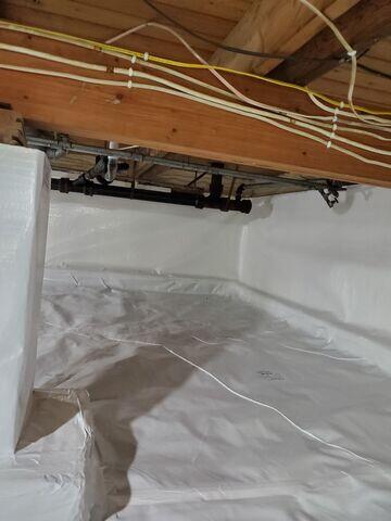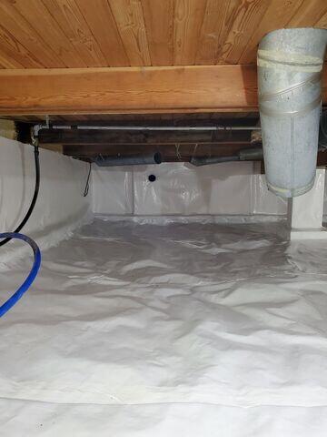 To solve this home's crawl space problem, Sure-Dry Basement Systems installed their CleanSpace® Crawl Space Vapor Barrier System. This durable, bright white crawl space liner installs on the walls and floors, preventing water vapor and humidity from passing through. By keeping your crawl space dry, you protect your structure and insulation from mold and rot.