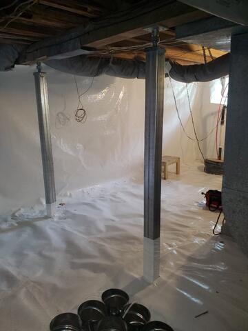 To fully fix the problem, we created a plan that addressed both moisture and structural support. Our crew started by installing the CleanSpace® vapor barrier system to seal the crawl space and block out ground moisture. The liner was carefully placed and secured to help create a cleaner, drier environment beneath the home.