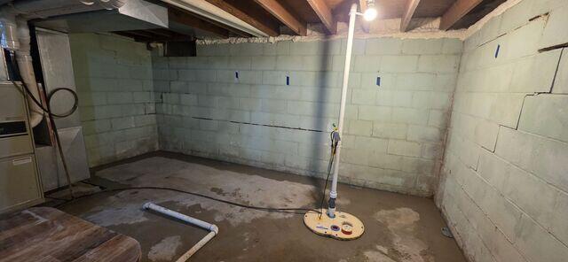 With no sump pump, the basement of this home in Van Dyne, WI was experiencing flooding due to water coming in from the basement walls and no system in place to drain and discharge the water.