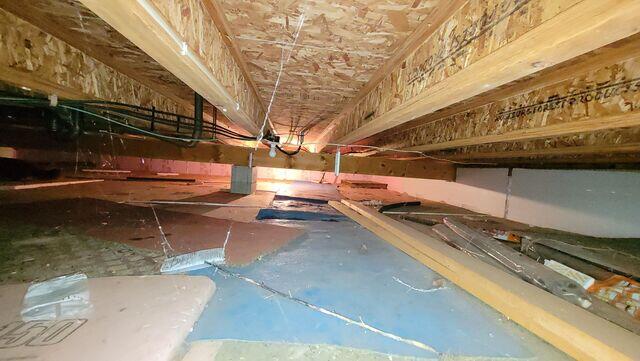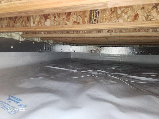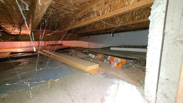 During the crawlspace inspection, a Sure-Dry System Design Specialist evaluated moisture sources, insulation gaps, and air leakage at the rim joists contributing to humidity and temperature loss. Findings confirmed that vapor intrusion and unsealed rim areas were driving the crawlspace issues.