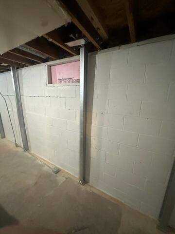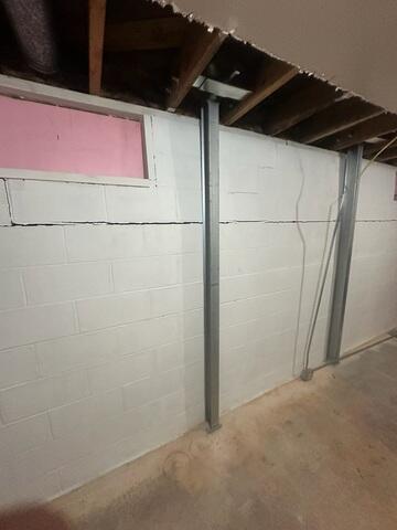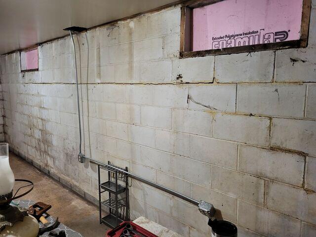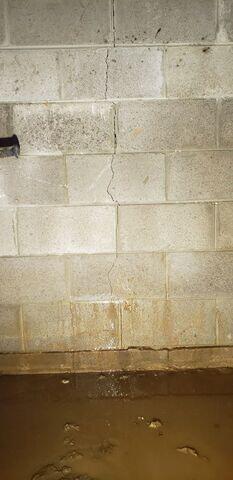A homeowner in Oconto Falls noticed a horizontal crack and sections of a basement wall bowing inward. During wet seasons the movement worsened, with stair-step cracking near corners—clear signs of lateral soil pressure threatening long-term stability.